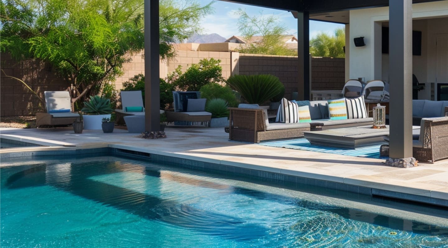 Upgrade your pool deck with durable and stylish materials such as pavers, natural stone, porcelain, or others. Consider adding features like built-in seating, fire pits, outdoor kitchens, and patio covers to create a functional and inviting outdoor living space.